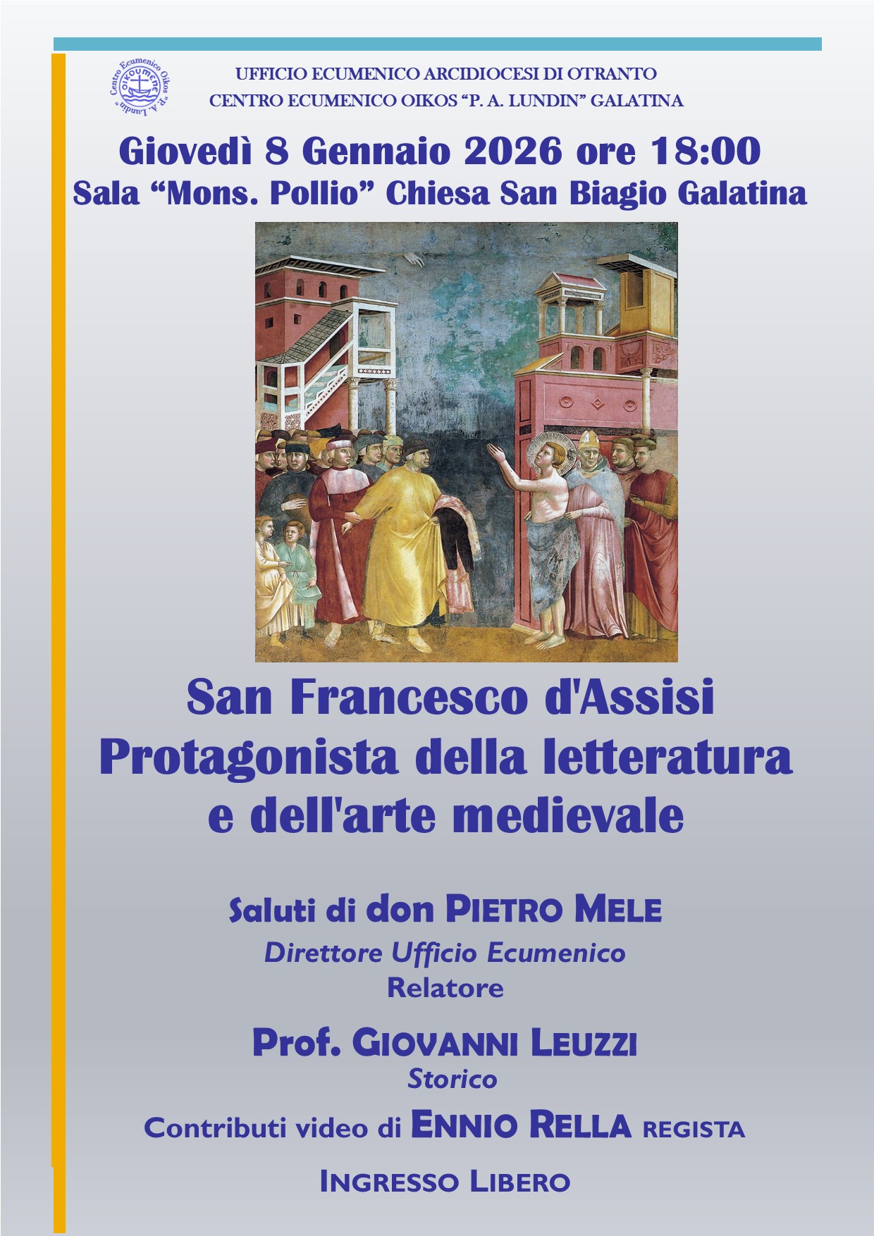 Siamo lieti di annunciare che l’incontro su “San Francesco d’Assisi protagonista della letteratura e dell’arte medievale” che inizialmente era stato previsto per il 28 novembre 2025 e poi rimandato per motivi di forza maggiore, si terrà il prossimo 8 gennaio 2026, alle ore 18:00, presso la Sala Pollio della Chiesa di San Biagio a Galatina.