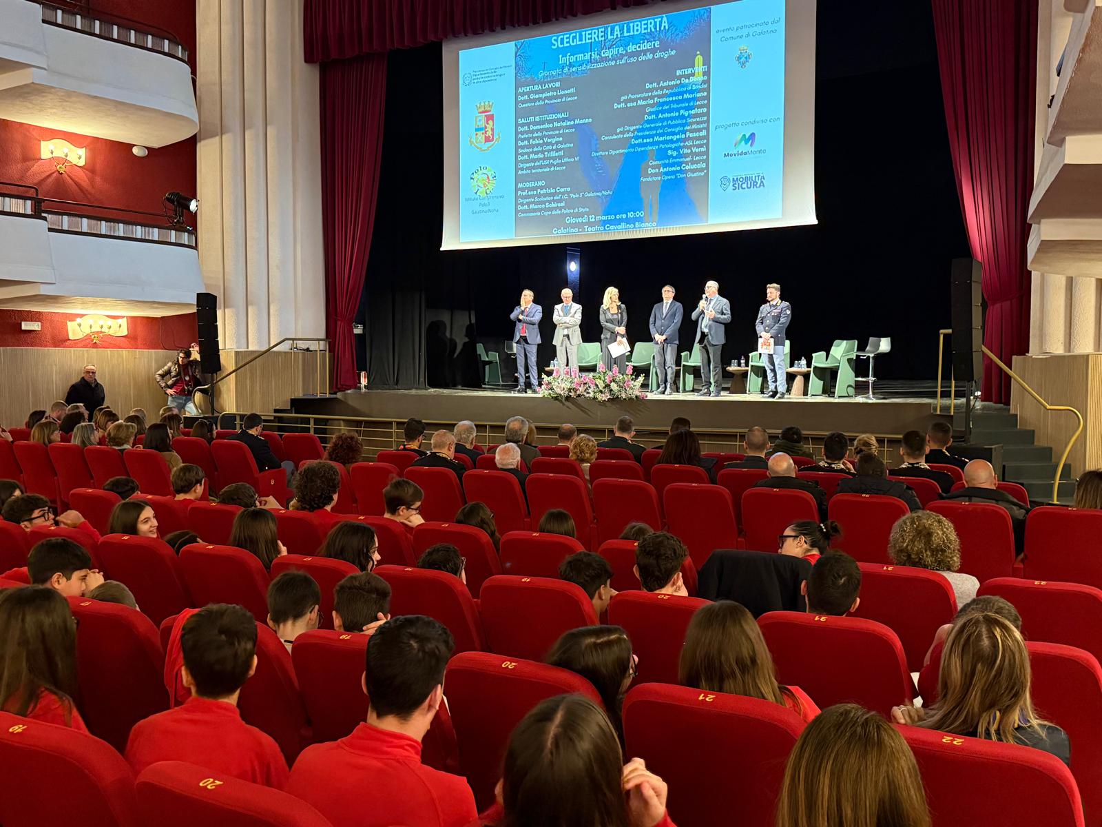 Si è svolta oggi, 12 marzo 2026, presso Teatro “Cavallino Bianco” di Galatina , un'iniziativa di sensibilizzazione sull’uso delle droghe e sulla cultura della legalità. L’evento, dal titolo “Scegliere la libertà. Informarsi, capire, decidere”, è stato promosso dalla Polizia di Stato di Lecce e dall’Istituto Comprensivo Polo 3 di Galatina, con il patrocinio del Comune di Galatina.