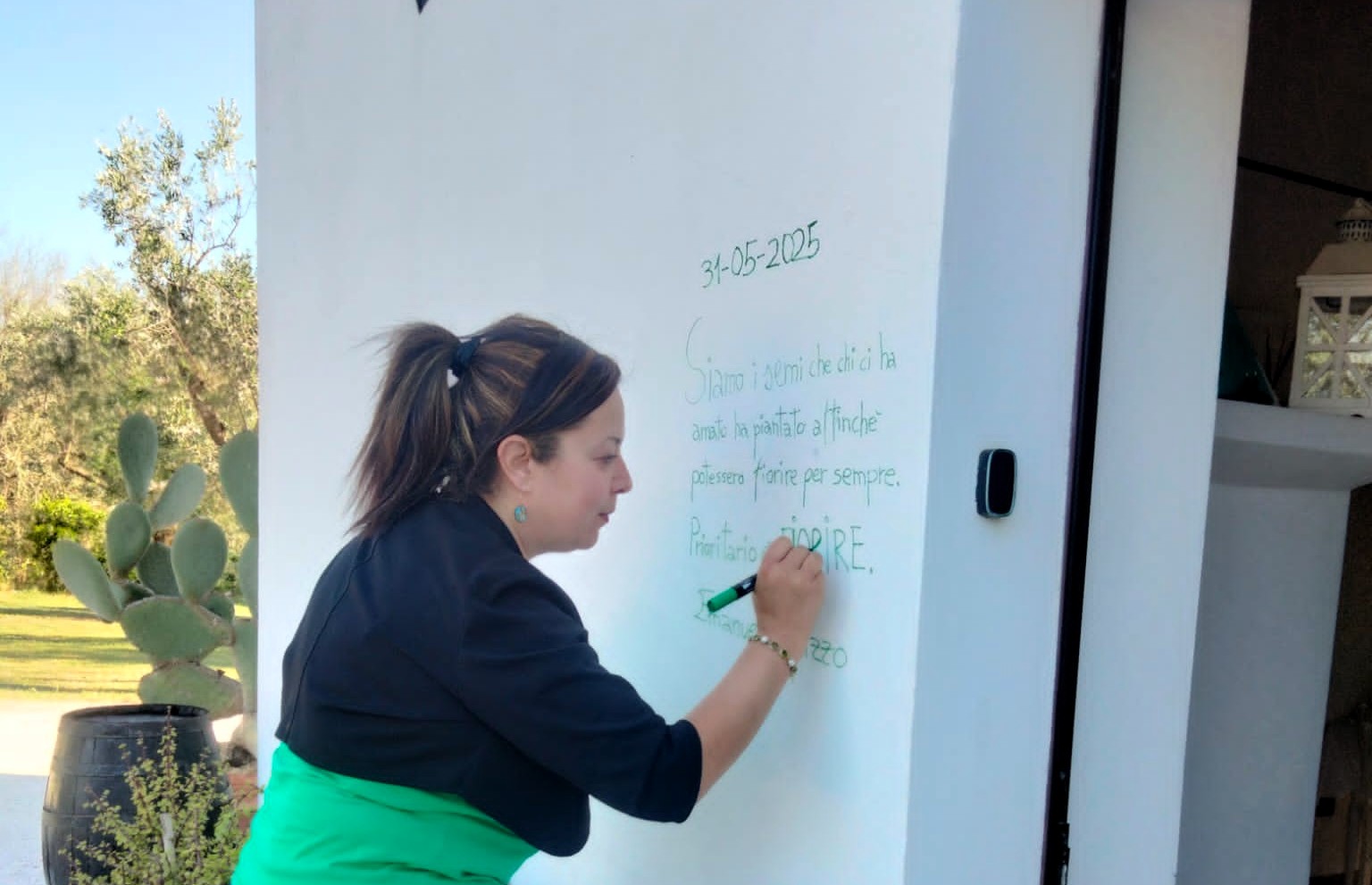 Dedico questi versi alla meravigliosa famiglia di Alberto Argentieri Masseria Monache, alla famiglia Argentieri, a questa splendida masseria, a tutti coloro che ci lavorano, invitando tutti a vivere la magia di questo posto, che preserva l'incanto della tradizione. Il loro olio è veramente come oro, prezioso e raro. I versi riportati sul muro sono: