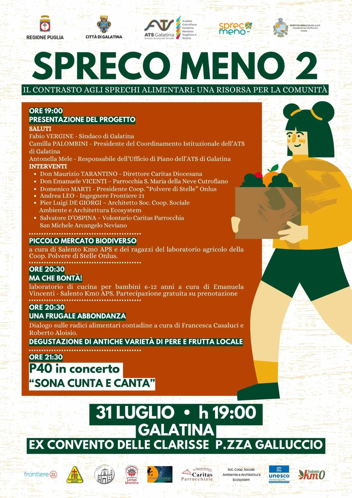 L’evento è organizzato dall’Ambito Territoriale Sociale di Galatina (Comuni di Galatina, Cutrofiano, Comune Aradeo, Neviano, Sogliano Cavour, Soleto). Dopo i saluti istituzionali di benvenuto da parte del Sindaco di Galatina Fabio Vergine, del Presidente del Coordinamento Istituzionale dell’ATS di Galatina Camilla Palombini e della Responsabile dell’Ufficio di Piano dell’ATS di Galatina Antonella Mele; l’incontro, vedrà come relatori Don Maurizio Tarantino Direttore Caritas Diocesana; Don Emanuele Vicenti – Parrocchia S. Maria della Neve Cutrofiano; Domenico Marti - Presidente Coop. “Polvere di Stelle” Onlus; Andrea LEO - Ingegnere Frontiere 21; Pier Luigi De Giorgi – Architetto Soc. Coop. Sociale Ambiente e Architettura Ecosystem; Salvatore D’Ospina – Volontario Caritas Parrocchia San Michele Arcangelo Neviano. Il progetto già insignito del Premio di eccellenza nazionale “Verso un’economia circolare” promosso dalla Fondazione Cogeme, vuole costituire una leva di attivazione di importanti reti territoriali tra le principali organizzazioni del terzo settore tradizionalmente impegnate nel contrasto degli sprechi alimentari, nel recupero delle eccedenze e nelle azioni di prossimità per il contrasto alle povertà. La serata continuerà con il Piccolo Mercato biodiverso a cura di Salento Km0 APS e dei ragazzi del laboratorio agricolo della Coop. Polvere di Stelle Onlus; il laboratorio di cucina “Ma Che Bontà!” per bambini 6-12 anni a cura di Emanuela Vincenti - Salento Km0 APS (partecipazione gratuita su prenotazione +39 329 812 0306). Dalle ore 20:30 Francesca Casaluci e Roberto Aloisio dialogheranno sulle radici alimentari contadine. Si chiuderà alle alle 21.30 con P40 in concerto. 𝐏𝐚𝐬𝐪𝐮𝐚𝐥𝐞 𝐐𝐮𝐚𝐫𝐚𝐧𝐭𝐚 𝐢𝐧 𝐚𝐫𝐭𝐞 𝐏𝟒𝟎. Poeta del quotidiano, umile, ironico, buffone, P40 vive e lavora nel Salento da cui riceve numerose influenze, che riesce abilmente a filtrare e rielaborare. 𝐿𝑎 𝑠𝑢𝑎 𝑎𝑟𝑡𝑒 𝑠𝑎 𝑑𝑖 𝑝𝑜𝑚𝑜𝑑𝑜𝑟𝑜, 𝑑𝑖 𝑝𝑒𝑐𝑜𝑟𝑖𝑛𝑜, 𝑑𝑖 𝑏𝑎𝑠𝑖𝑙𝑖𝑐𝑜...Alla base del lavoro di P40 c’è l’osservazione attenta e critica del suo tempo che l’artista cerca di ri-significare nei suoi spettacoli, attraverso un repertorio di brani inediti composto dallo stesso. Incarnando un incontro tra la figura del cantautore e quella dell’attore, che insieme convivono sul palco portando in scena una rappresentazione quasi teatrale, essenziale, a tratti geniale ma nello stesso tempo ricca di improvvisazioni che giocano sugli equivoci e sulle sensazioni del pubblico.
