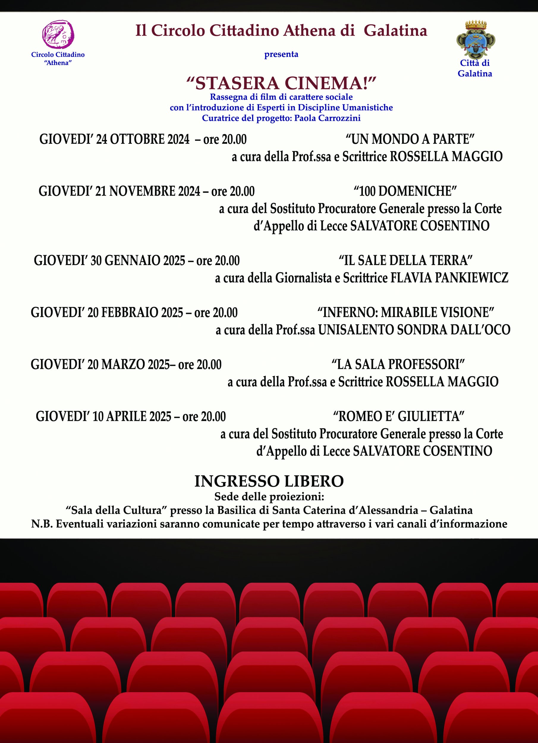 I titoli dei film, i nomi degli esperti, i giorni e gli orari di proiezione sono indicati nella locandina allegata. Nel caso di esaurimento dei posti in sala, sono disponibili altri posti a sedere nel palco superiore. Si raggiungono attraverso le scale, entrando a SX.