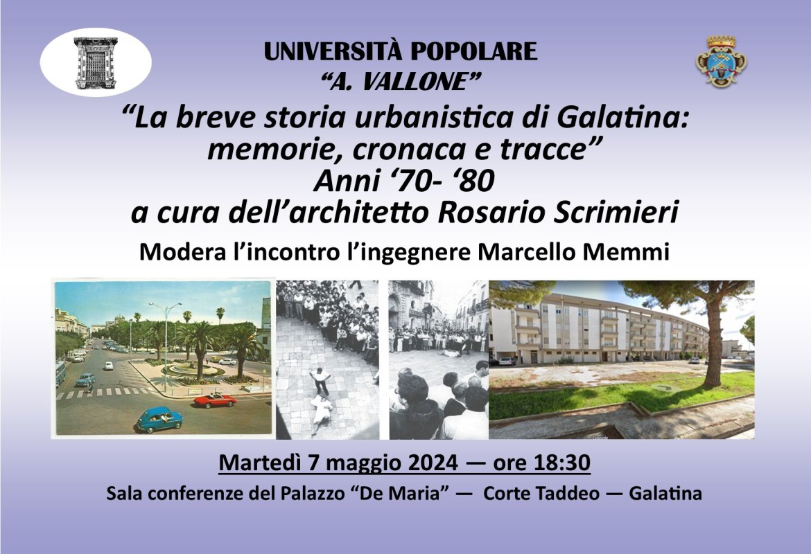 Oggi martedì 7 maggio 2024 alle ore 18:30, nella Sala conferenze dell’ex Palazzo De Maria, in Corte Taddeo, avrà luogo il secondo incontro del Corso dal titolo “La breve storia urbanistica di Galatina: