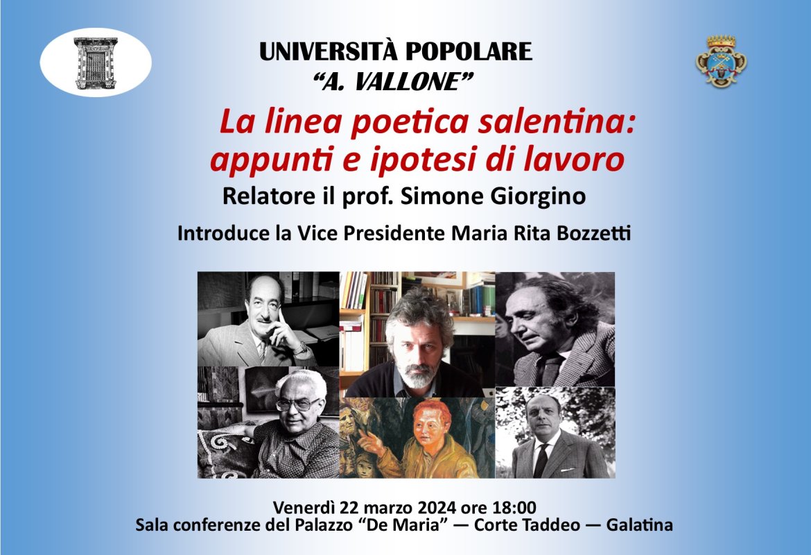 Oggi venerdì 22 marzo 2024 alle ore 18:00, nella Sala conferenze dell’ex Palazzo De Maria, in Corte Taddeo, è in programma il terzo e conclusivo incontro che l’Università Popolare dedica alla poesia: