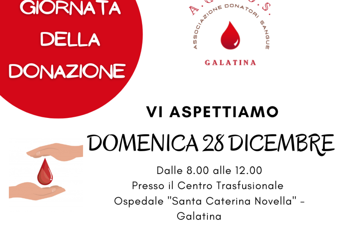 A.GA.DO.S., Associazione Galatinese Donatori Sangue, comunica che la prossima Giornata della donazione si terrà domenica 7 Gennaio 2024 presso il Centro trasfusionale dell'ospedale “Santa Caterina Novella” di Galatina, dalle ore 8:30 alle ore 12:00