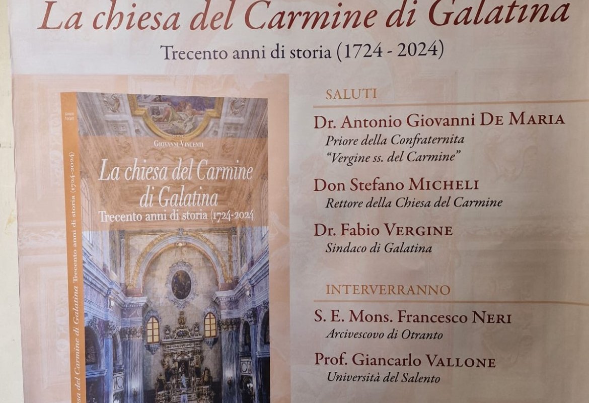 Ricorre quest'anno il III Centenario della costruzione della Chiesa Madonna del Carmine di Galatina. La precisa indicazione cronologica con cui si inaugurò una nuova, evangelica pagina di bellezza