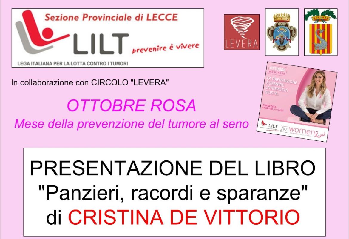 La LILT di Noha, in collaborazione con il Circolo Levèra, in occasione dell'Ottobre Rosa (mese della prevenzione del tumore al seno) organizza la presentazione del libro di Cristina De Vittorio "Pansieri, racordi e sparanze".
