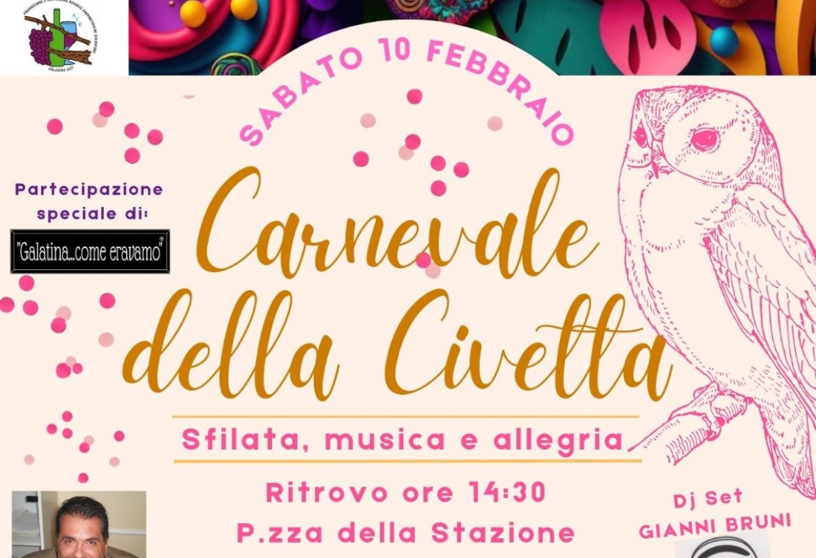 Tutto pronto per il Carnevale della Civetta a Galatina che si terrà a Galatina questo Sabato, 10 Febbraio 2024, dalle ore 14:30 con ritrovo e partenza della sfilata dei gruppi mascherati da P.zzale Stazione.