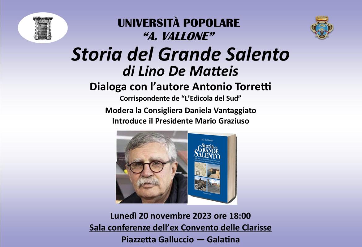 Ultimo incontro, oggi lunedì 20 novembre 2023 alle ore 18:00, nella Sala conferenze dell’ex Monastero delle Clarisse", in Piazzetta Congedo, del Corso dal titolo "Il territorio: focus sul Salento e la Puglia", organizzato dalla Università Popolare “Aldo Vallone”.