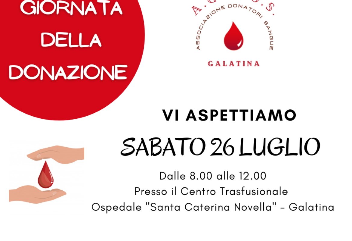 A.GA.DO.S., Associazione Galatinese Donatori Sangue, comunica che la prossima Giornata della donazione si terrà Sabato 23 Marzo 2024 presso il Centro trasfusionale dell'ospedale “Santa Caterina Novella”