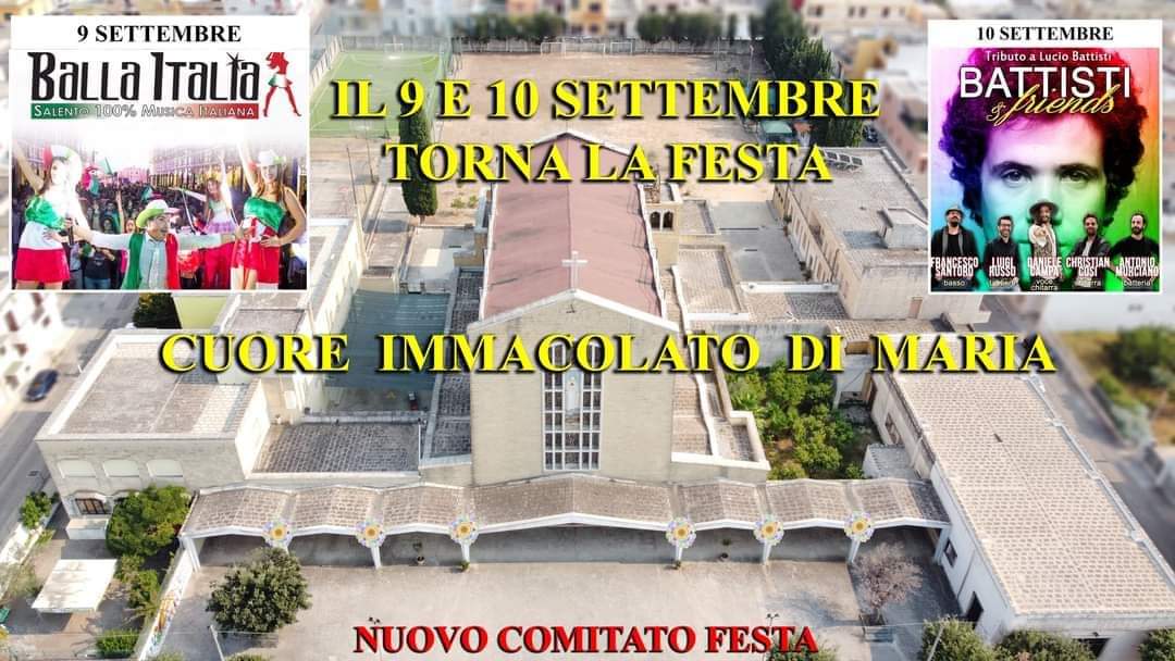 Il 9 e 10 settembre 2023 tornerà nel Rione Italia a Galatina la festa del Cuore Immacolato di Maria. Sabato 9, dopo la messa delle ore 19, si terrà la processione che percorrerà le seguenti vie: Soleto, Foggia, Potenza, Pistoia, Genova, Caserta, Savona, Imperia, Soleto, Cagliari, Sorrento, Mantova, Bergamo, Bolzano, Ferrara, Bologna, Piazzale della chiesa. Sarà accompagnata dalla Banda San Gabriele di Noha.