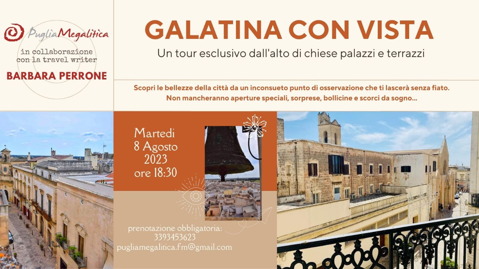 L' Associazione Puglia Megalitica in collaborazione con la Travel Writer Barbara Perrone ripropone dopo il successo del primo appuntamento GALATINA CON VISTA domenica 27 Agosto 2023 alle ore 17:00 : un tour esclusivo dall'alto di chiese palazzi e terrazze per concedere ai visitatori uno sguardo d'eccezione su una città che mai finisce di sorprendere. Non perdere l'ultimo appuntamento della stagione! Accompagnati da una guida riconosciuta dalla Regione Puglia, varcheremo soglie di strutture private per raggiungere balconi e terrazze che affacciano su punti significativi della città, godremo del calare del sole dall'alto di Piazza San Pietro, perdendoci nei nostri vicoli ricchi di bellezza per raggiungere i nostri punti d'osservazione speciali. Non mancheranno sorprese, aperture speciali e una conclusione da lasciare senza fiato. Chi ci conosce sa di cosa parliamo.