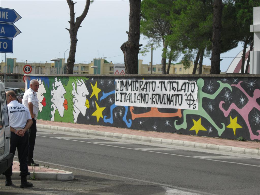 Hanno agito nel buio della notte fra giovedì e venerdì. Sembra che qualcuno abbia visto un ragazzo ed una ragazza aggirarsi in via Ugo Lisi armati di secchi e pennelli e poi, alle prime luci dell'alba abbia scoperto lo striscione. "L'immigrato tutelato l'italiano rovinato". Le lettere sono nere e scritte in stampatello. Il simbolo posto come firma in basso a destra è quello di un cerchio tagliato da una croce a bracci uguali con, a sinistra una lettera 'A' e a destra una 'S'. Il muro su cui è stato affisso è quello decorato, qualche settimana fa con un murales.