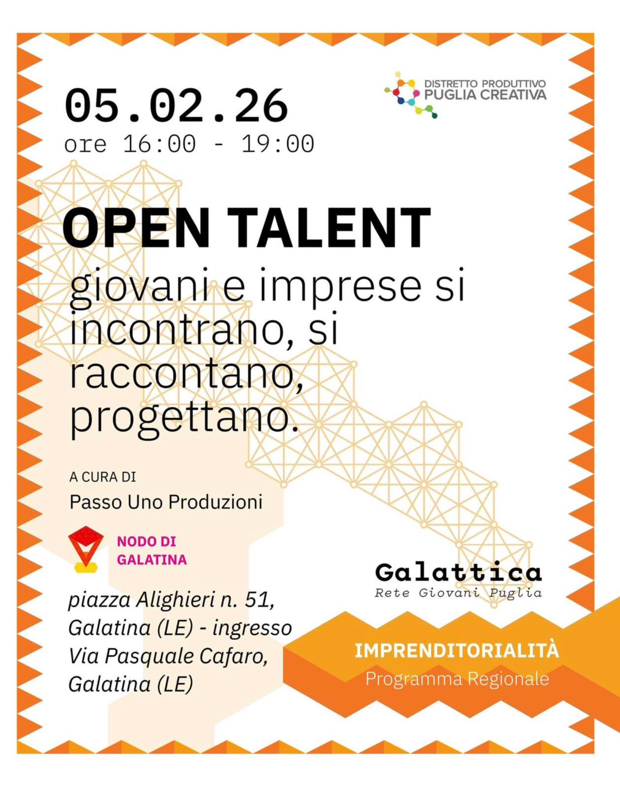 L’Associazione Distretto Produttivo Puglia Creativa, nell’ambito delle azioni di supporto alla Rete Galattica, a cura della Sezione Politiche Giovanili e di Arti, Agenzia Regionale per la tecnologia e l’innovazione - propone il format "Open Talent", un laboratorio esperienziale che mette in relazione diretta giovani under 35 con imprese culturali e creative del territorio.