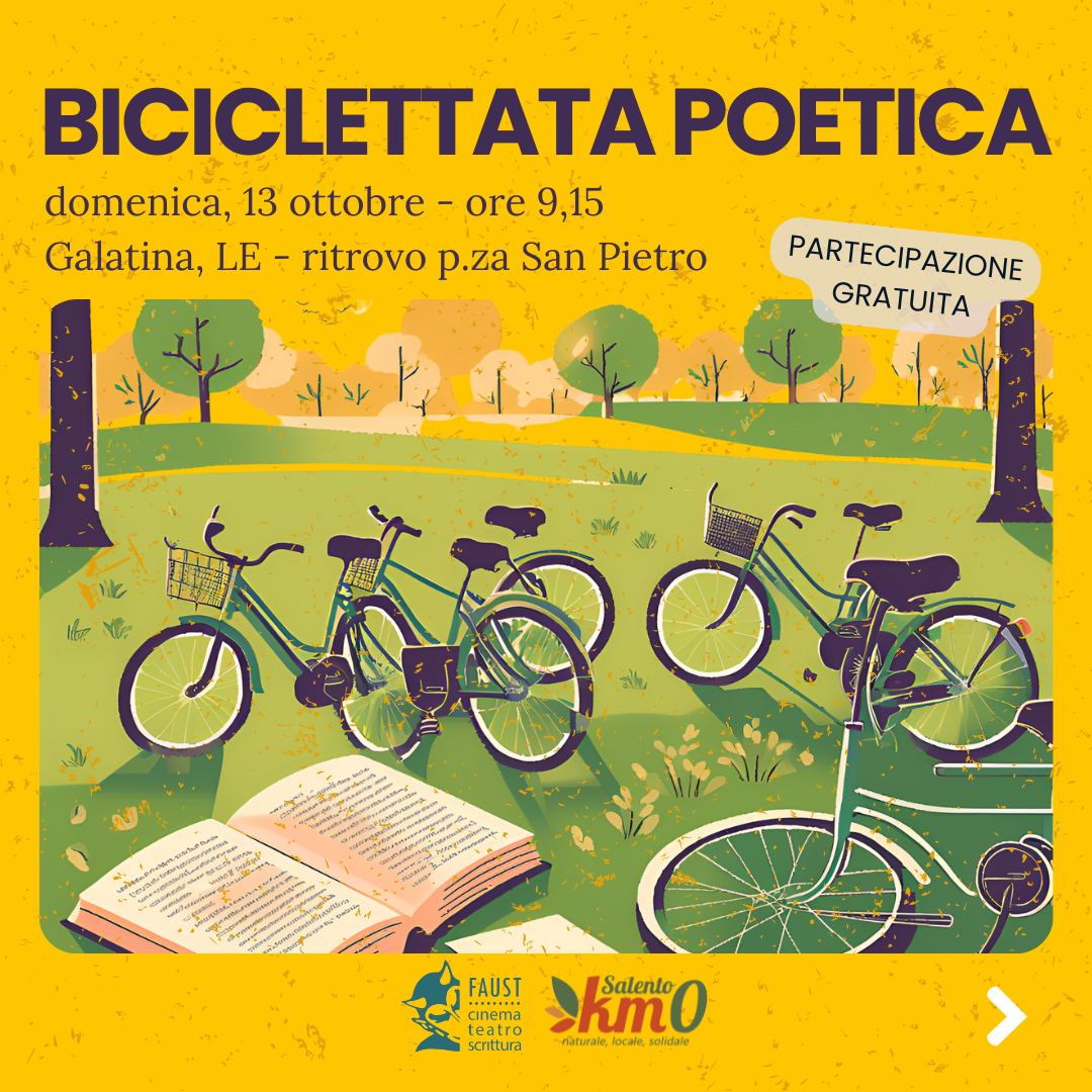 Domenica 13 ottobre 2024 avrà luogo la prima biciclettata poetica, 12 km tra la natura intorno alla città di Galatina. L'appuntamento sarà in piazza San Pietro alle ore 9:15.