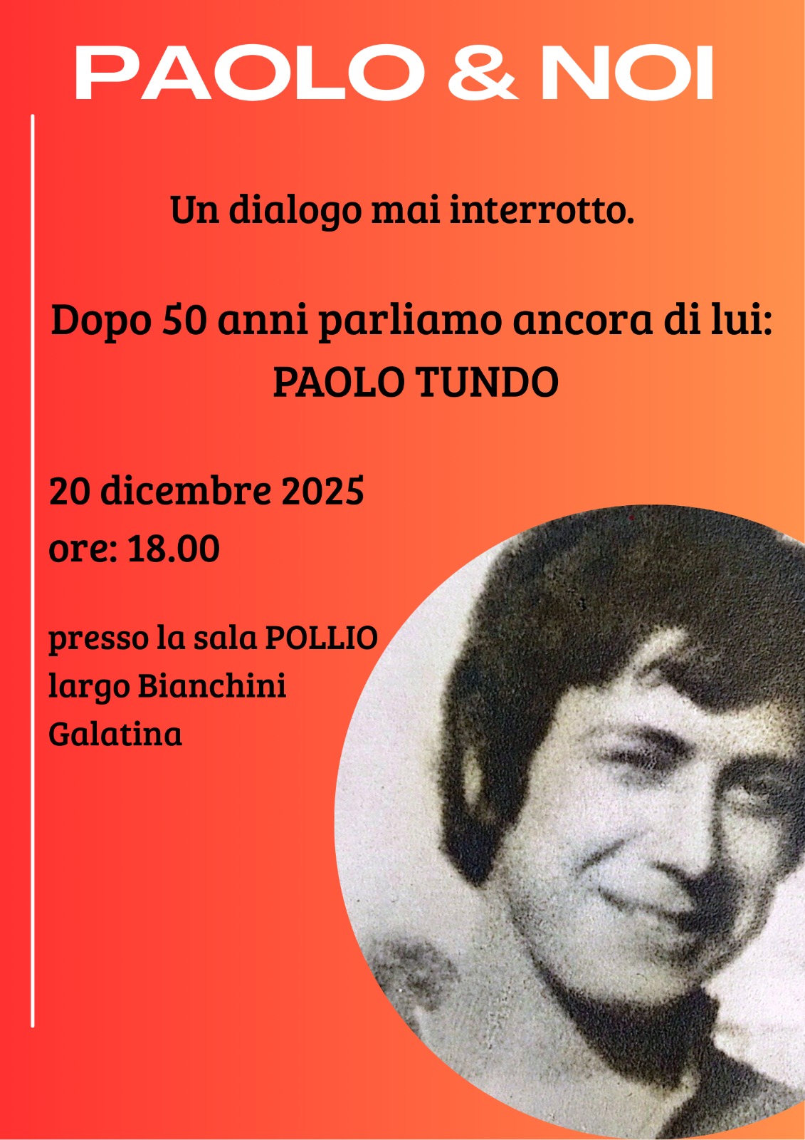 Sono davvero tanti cinquant’anni…una vita. Eppure dopo tanto tempo il ricordo di Paolo Tundo resta limpido e vivo nel cuore di tutti quelli che lo hanno conosciuto, che gli hanno voluto bene, quelli che hanno condiviso con lui un bel tratto di strada. Quella strada che per Paolo si è interrotta cinquant’anni fa.