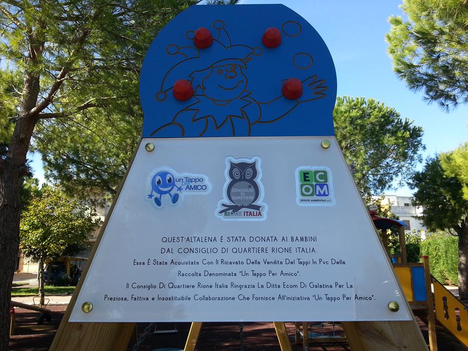 Ieri mattina, in Piazzetta Fedele, è stata posizionata un targa sull'altalena che il Consiglio di Quartiere RIONE ITALIA in collaborazione con la ditta ECOM di Galatina, ha donato ai bambini del Rione e della Città. "Ciò è stato possibile -spiega Massimo Bello- grazie al ricavato della vendita dei tappi in PVC raccolti dai cittadini con l'iniziativa denominata "Un tappo per amico". La raccolta continua, nonostante il continuo furto di tappi dai contenitori, da parte di persone assolutamente estranee al Consiglio di Quartiere Rione Italia, che comunque stiamo cercando di ridurre e controllare in maniera capillare".