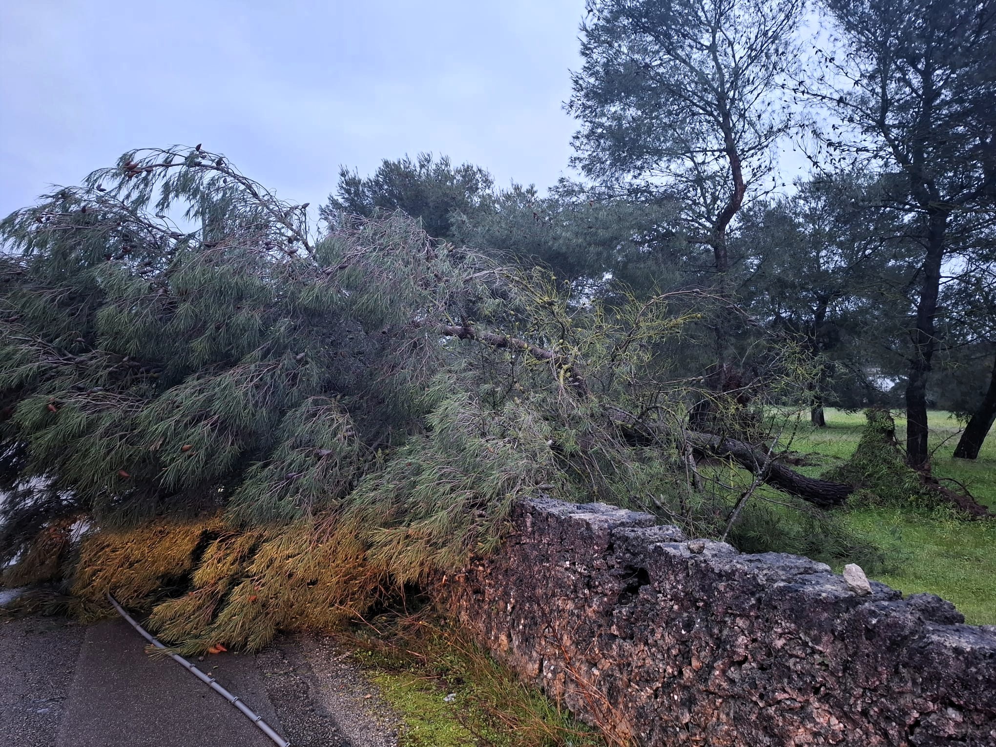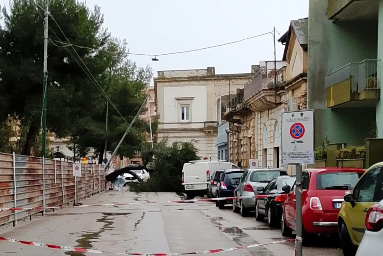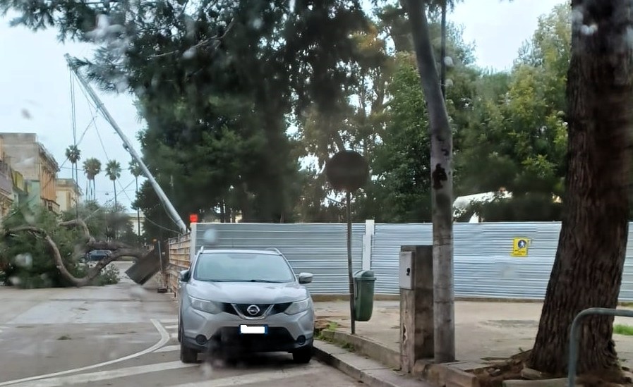 A Galatina in piazzale Stazione un pino è finito sui cavi della pubblica illuminazione trascinando un palo e rovinando sulla recinzione di cantiere.