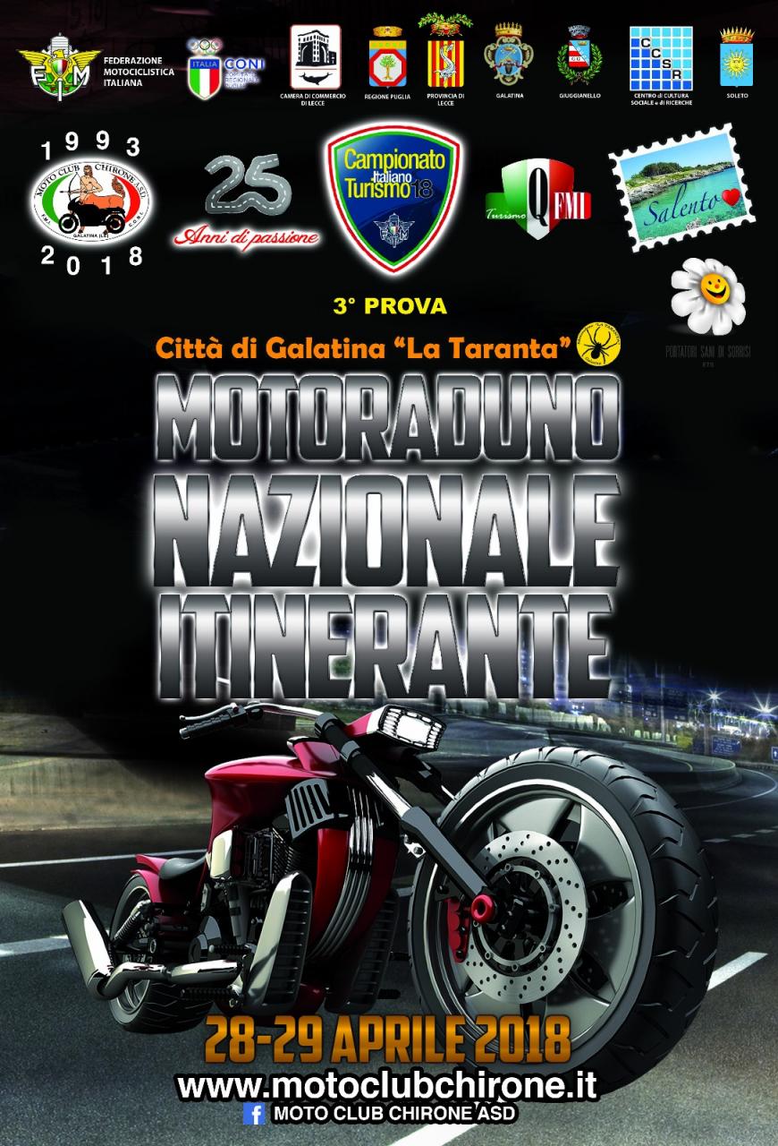 La manifestazione di lunga e collaudata tradizione è organizzata dal Moto Club Chirone A.s.d. che, quest’anno, celebra il 25° anniversario dalla sua nascita; è patrocinata dal Comune di Galatina, dalla Provincia di Lecce e dalla Regione Puglia ed è pronta a richiamare a sé l’interesse dei motociclisti provenienti da ogni parte d’Italia e non solo. L’evento, valido come 3° Prova di Campionato Italiano Turismo FMI 2018, è un’occasione per far visitare ed apprezzare le ricchezze artistiche, architettoniche e culturali ed i meravigliosi paesaggi che offre il Salento e, nello stesso tempo per far conoscere le tradizioni e l’aspetto eno-gastronomico locale. I centauri potranno partecipare alle visite guidate del Museo Pietro Cavoti e del centro storico di Galatina, per scoprirne gli antichi palazzi e le affascinanti Chiese, in particolare, la Basilica di Santa Caterina d’Alessandria (sec. XIV) . Sabato pomeriggio, durante l’itinerario turistico programmato, è prevista una sosta foto per ammirare lo spettacolare panorama che offre il Laghetto nella Cava di Bauxite di Otranto . Si percorrerà, poi, il meraviglioso tratto della litoranea adriatica, tra Porto Badisco e Santa Cesarea Terme. Giuggianello, il più piccolo comune della provincia di Lecce, ospiterà il 1° Check Point dei partecipanti. Qui, dopo le visite guidate all’interessante Museo Civico etno demo antropoligico della civiltà contadina, a cura del Centro di Cultura Sociale e di Ricerche, ed all’antico Trappeto Ipogeo, si concluderà la serata, a ritmo di pizzica e tamburelli, con cena presso il caratteristico ristorante agreste, Il Fòllaro, situato su di una collinetta, in un suggettivo scorcio tra gli ulivi. Domenica mattina, il Comune di Soleto, in Piazza Cattedrale, ai piedi della spettacolare Guglia Orsiniana, accoglierà i motociclisti per il 2°Check Point con un rinfresco offerto a tutti gli iscritti. Poi si raggiungerà l’Azienda Agricola Biologica Piccapane, situata nella verde campagna salentina, a pochissima distanza da Galatina, dove sarà offerta una degustazione di prodotti biologici e si concluderà la manifestazione con le Premiazioni FMI.