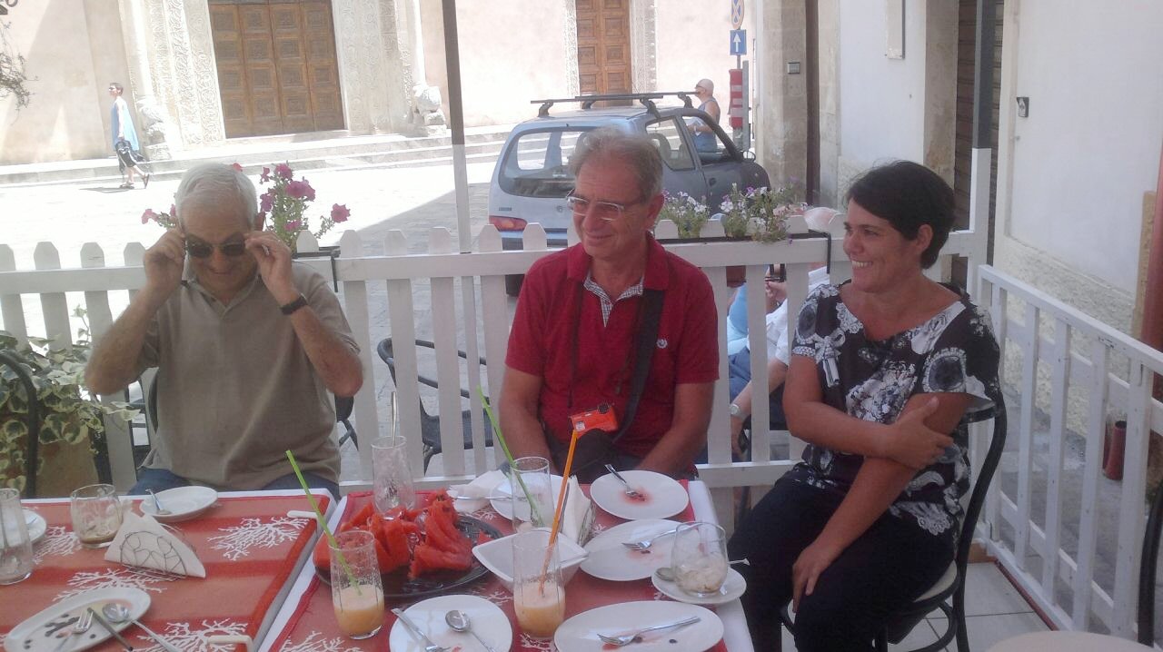 Dopo aver nutrito la mente il gruppetto, composto anche da una funzionaria della Regione Puglia, da Andrea Coccioli, assessore allo sport, e da Luigi Lagna, consigliere comunale passato per caso in piazzetta Orsini, ha sostato al Caffè della Basilica per rinfrescarsi con un’anguria di benvenuto offerta da Cristian Caloro. La granita al melone ha fatto, poi, meritare i complimenti alla fantasiosa gelataia.