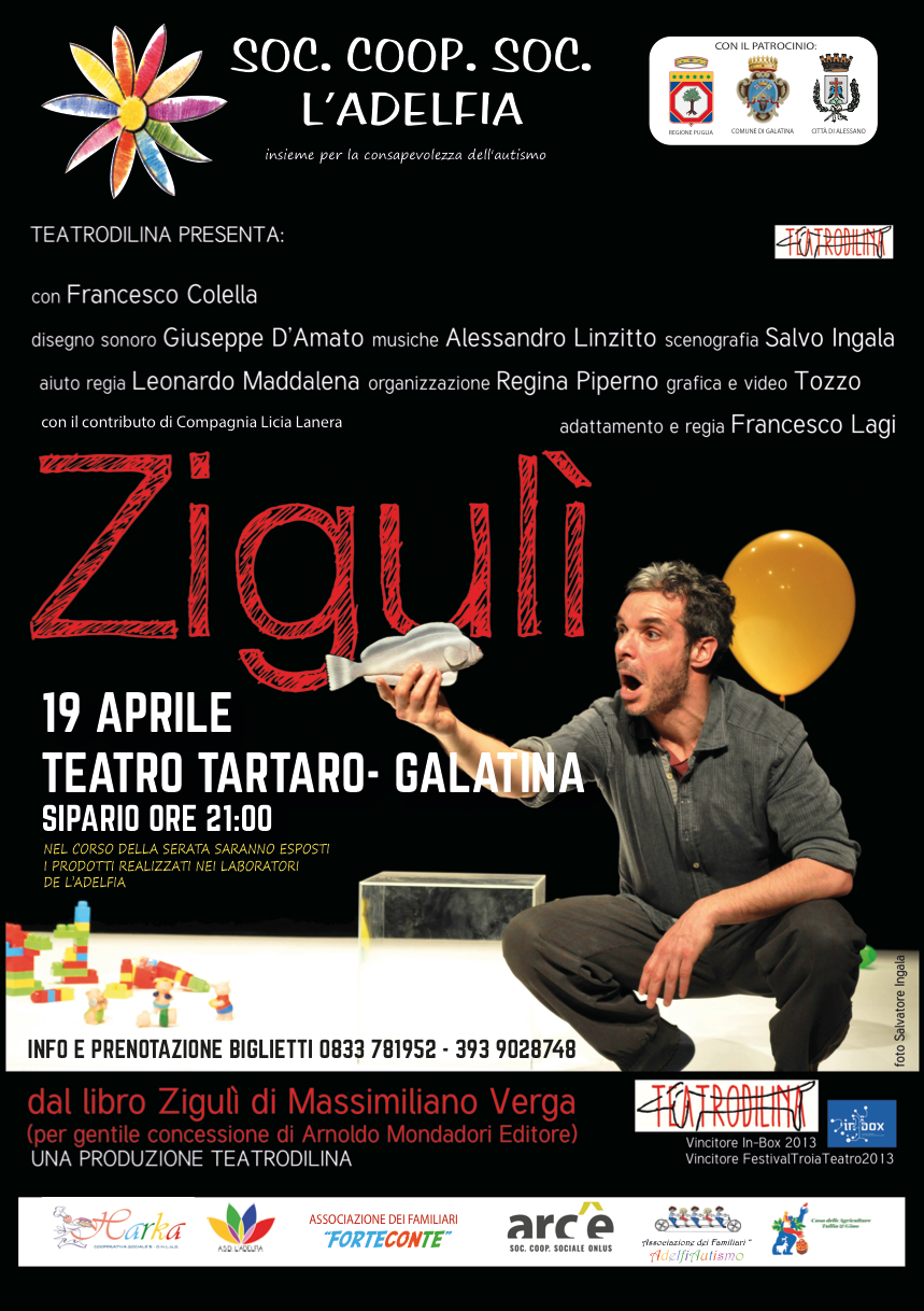 Una parola che fa paura, ma dentro la quale ci sono storie di coraggio e di amore profondo. Per conoscere l’autismo il primo passo è il ri-conoscersi nelle vite degli altri, in chi porta i segni di questa esperienza. Anche per questo la Cooperativa Sociale “L’Adelfia” con sede in Alessano, realtà che da quarant’anni è nella trincea del disagio psichico, ha voluto portare nel Salento “Zigulì”, lo spettacolo che la compagnia Teatrodilina ha tratto dall’omonimo libro di Massimiliano Verga, che racconta la sua esperienza con il figlio Moreno, nato sano e diventato gravemente disabile nel giro di pochi giorni. Moreno non è un bambino autistico ma l’ abbiamo scelto come testimonianza di quanto l’amore per un figlio possa spingere un padre ad affrontare tutti gli ostacoli, ma anche di come la solidarietà non sia mai abbastanza.